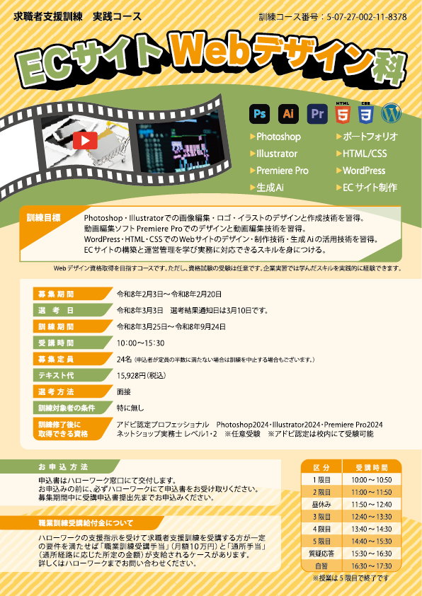 令和8年3月開講/ECサイトWebデザイン科募集![大阪] 2026年1月16日 募集のお知らせ 令和8年3月25日、阿波座校の求職者支援訓練「ECサイトWebデザイン科」を開講します。当校では令和8年2月3日より、受講生の募集を開始します。 募集要項は以下の通りです。画像をクリックするとPDFファイルで詳細がダウンロードできます↓↓↓