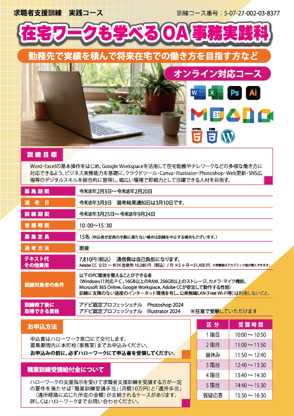 令和8年3月25日、阿波座校の求職者支援訓練「在宅ワークも学べるOA事務実践科」を開講します。
